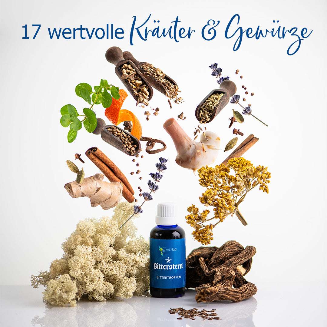 Lasse 7-10 Bittertropfen vor oder nach den Mahlzeiten langsam auf der Zunge zergehen und genieße die Kraft der Bitterkräuter. Du kannst Bitterstern bis zu 5-mal täglich verzehren.